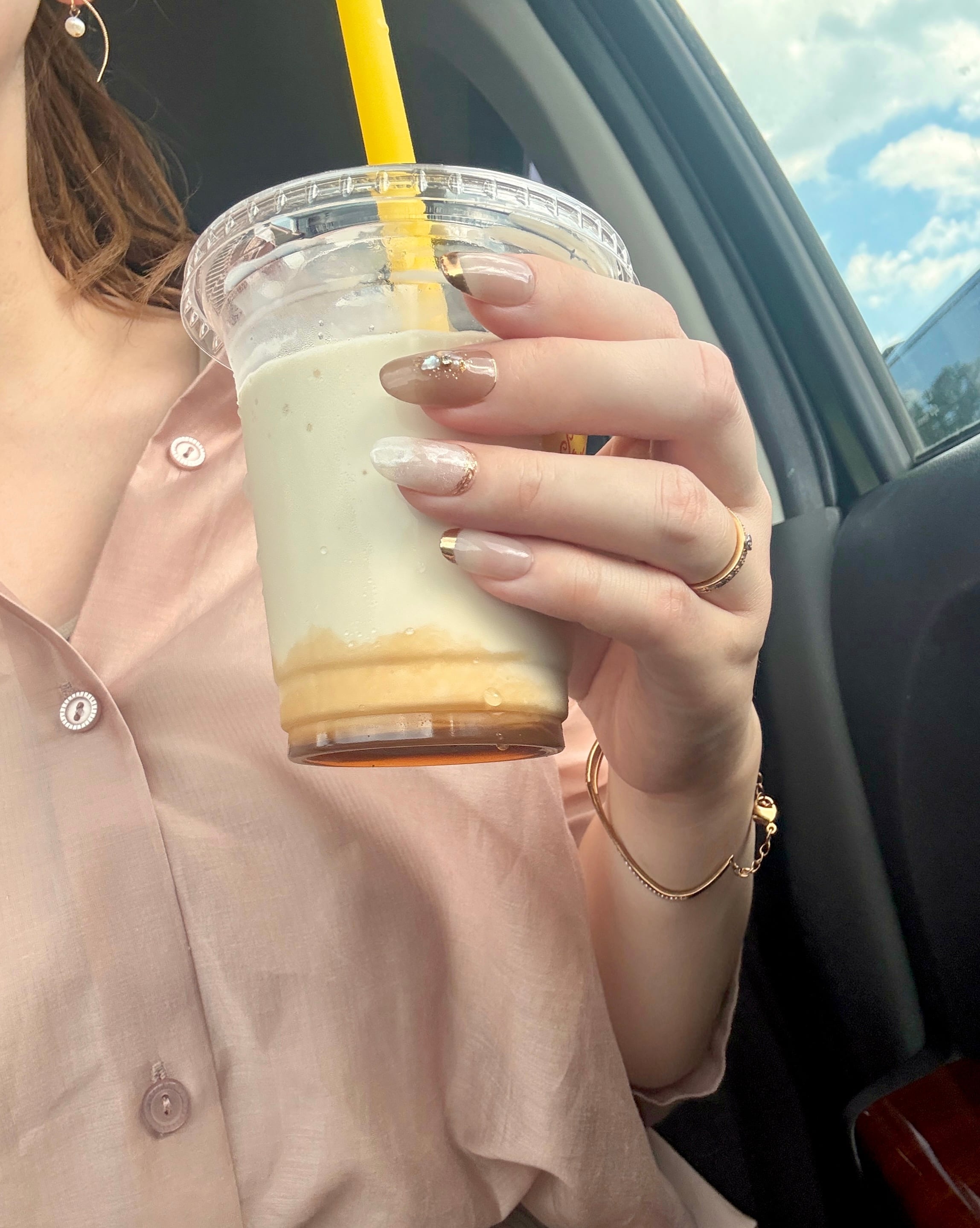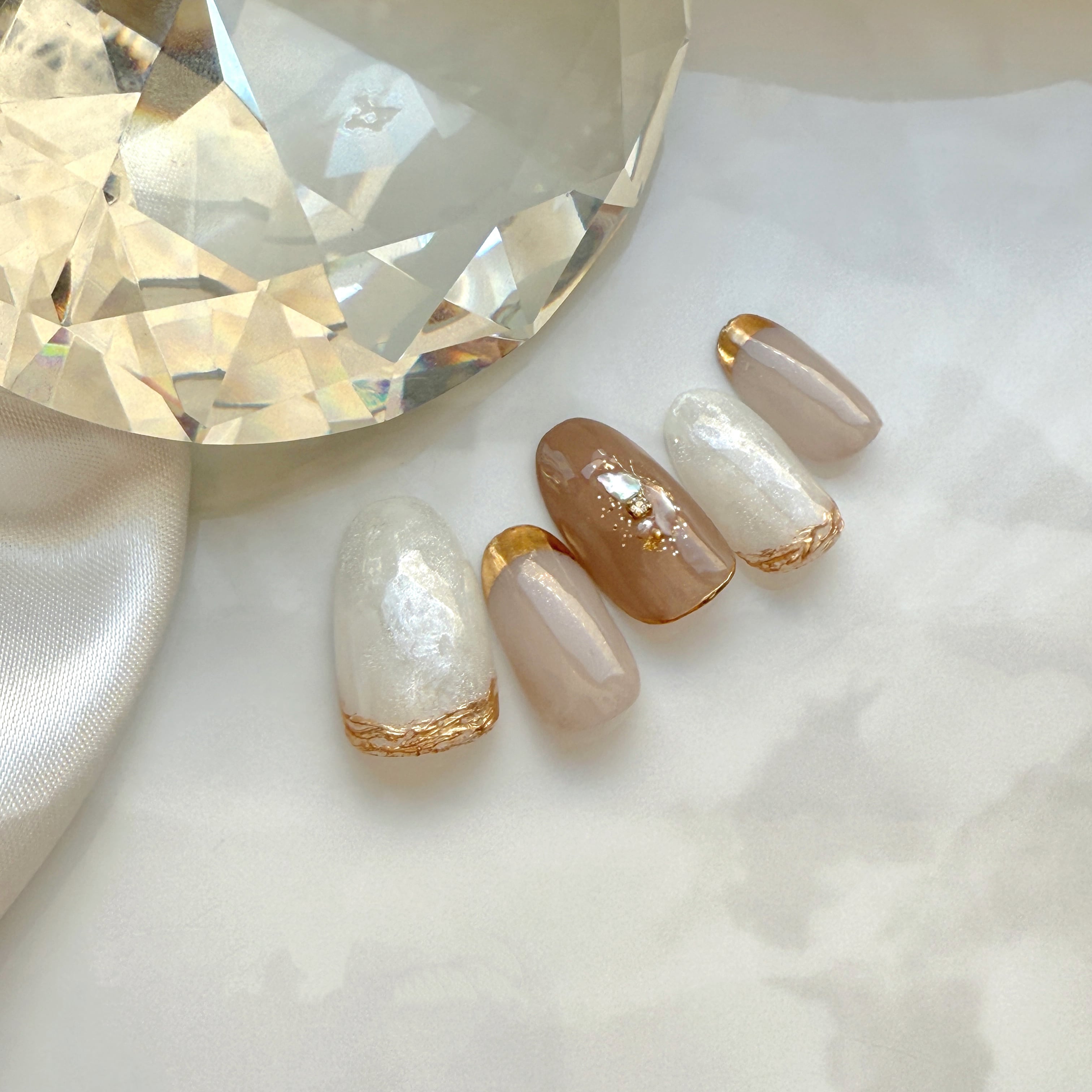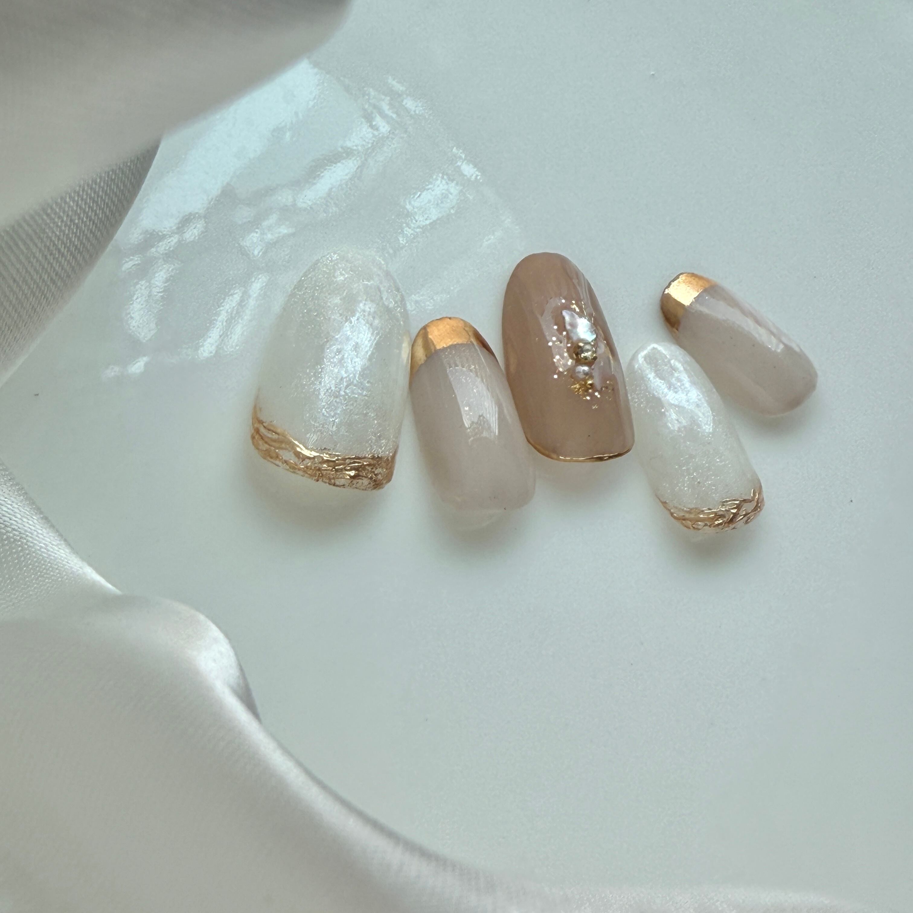 落ち着きのあるモカベージュを基調に、さりげないパール感のホワイトのニュアンス。