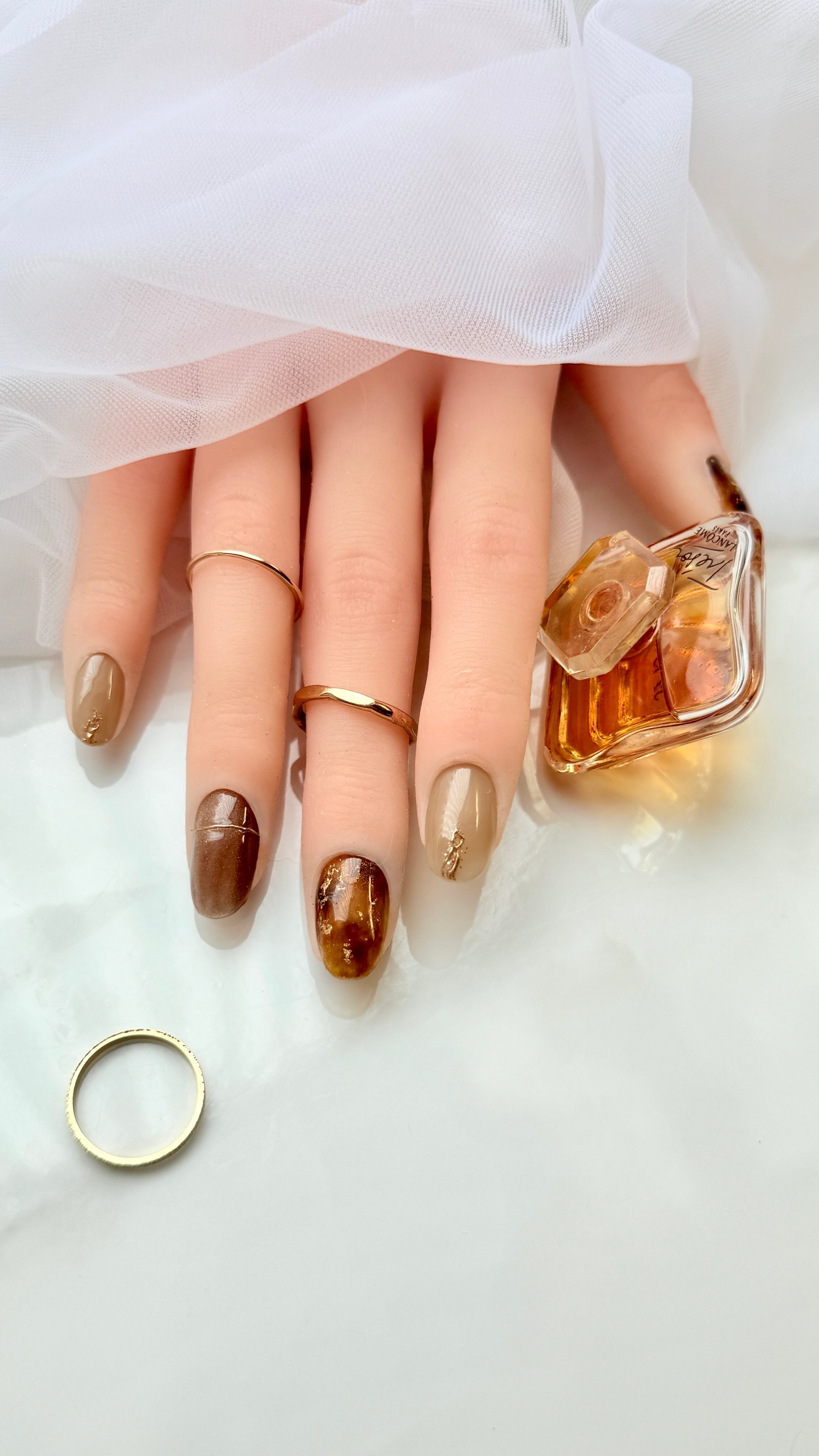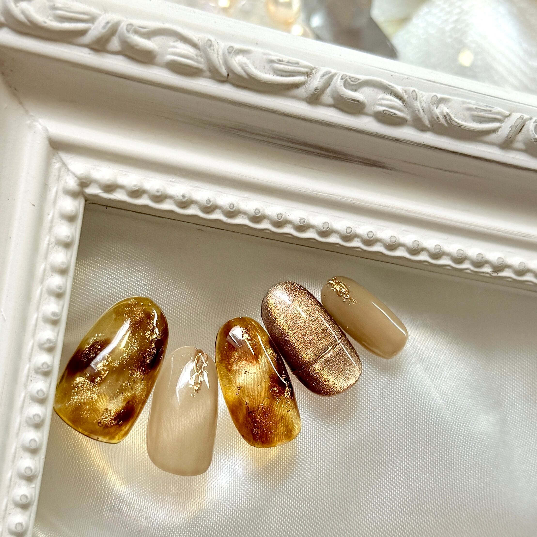 深みのあるべっ甲の輝きに、ゴールドのきらめきを添えた大人のためのニュアンスネイル。